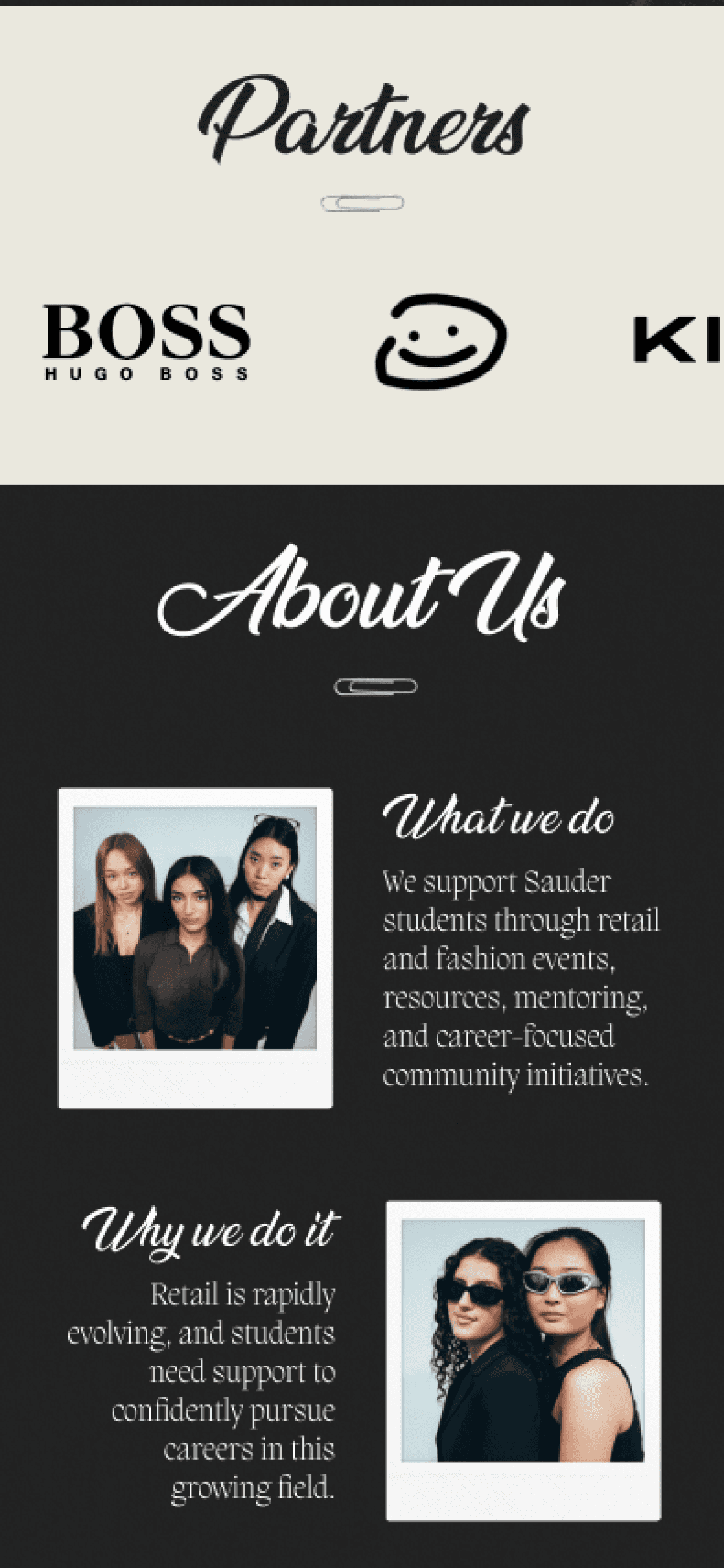 The home page showcases past events we’ve held, brands we’ve partnered with, and some info about us.